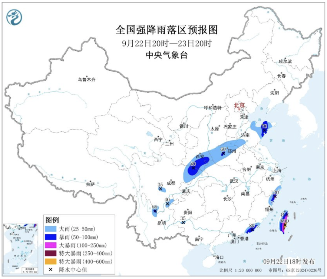中央气象台预计,22日20时至23日20时,四川盆地东北部和西南部、陕西南部、山西南部、河南中北部、山东西部和东部、浙江东南部、福建南部和东北部、广东东南部、台湾岛等地部分地区有大到暴雨,其中,浙江东南部、福建东北部、台湾岛东部等地部分地区有大暴雨,台湾岛东部局地特大暴雨。
