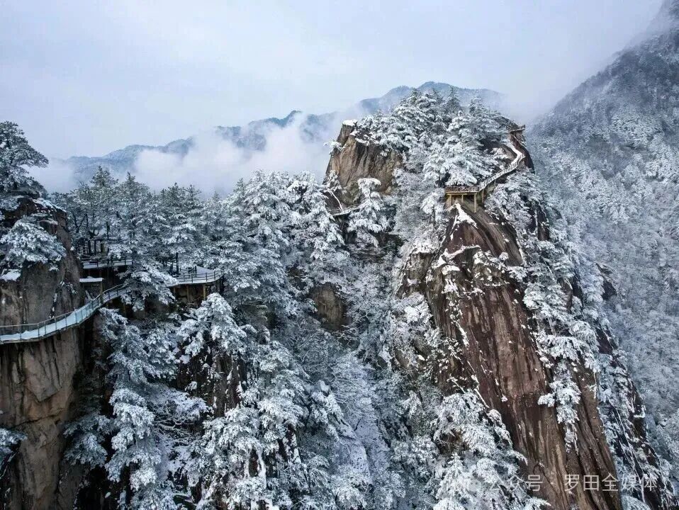 雪后的天堂寨银装素裹,花岗岩山峰在白雪覆盖下更显巍峨,瀑布凝结成冰挂,如水晶般剔透。此时长江江面薄雾缭绕,山上的雪景与江上的雾景相映,宛如仙境。