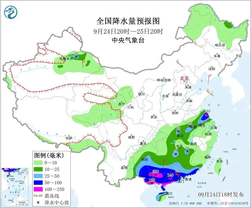 中央气象台24日18时继续发布暴雨橙色预警,预计24日20时至25日20时,广东大部、广西大部、海南岛北部和西部、贵州南部、云南东南部、江苏中部等地有大到暴雨,其中,广东中南部、广西中南部、江苏中部等地部分地区有大暴雨。