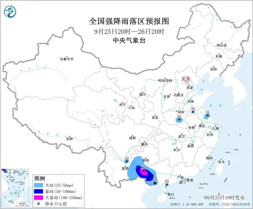 中央气象台25日18时发布暴雨蓝色预警:预计25日20时至26日20时,广西中西部、云南东部、贵州西南部、广东西部以及河南南部、江苏中部等地部分地区有大到暴雨,其中,云南东南部、广西西部等地部分地区有大暴雨。