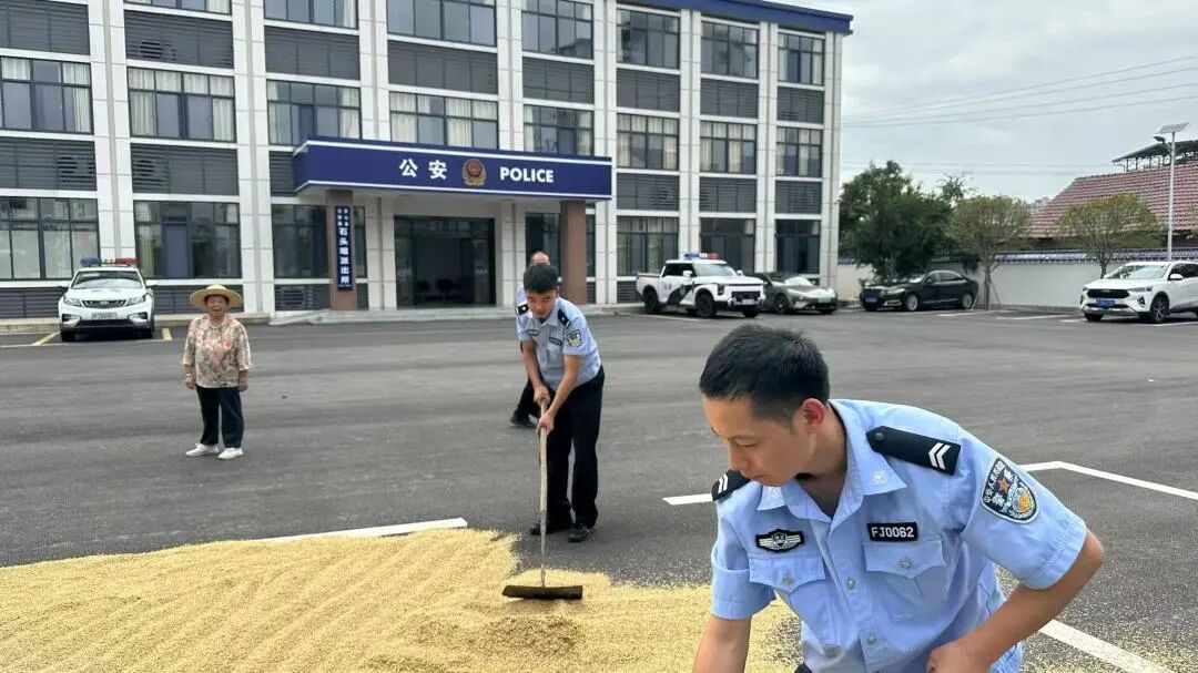 9月23日一早,派出所的大门敞开了,装满湿漉漉稻谷的三轮车陆续开进院子。平整宽阔的地面在阳光下泛着光,成了临时的“黄金晒场”。更让乡亲们没想到的是,民辅警们也纷纷撸起袖子、拿起竹耙,趁着工作间隙就来帮忙摊谷、翻晒。有的弯着腰一耙一耙把稻谷推开,有的蹲下身检查湿度,汗水浸湿了警服,脸上的笑容却一直没停。