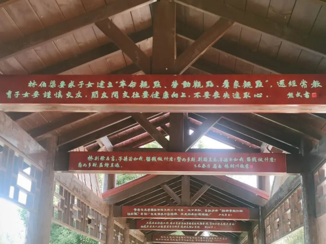 为让这份精神力量具象传承,书艺廊八根横梁被赋予独特寓意。每根横梁两面承载独立又交融的内涵:一面镌刻红安孕育的八例红色家风故事,或为先辈舍家为国,或为后人薪火坚守,皆凝聚红色基因力量;另一面呈现林清芝家族 —— 林氏一脉相承的八条家训,从勤俭持家到崇文尚礼,从孝老爱亲到心怀天下,皆是中华优秀传统文化的生动缩影。