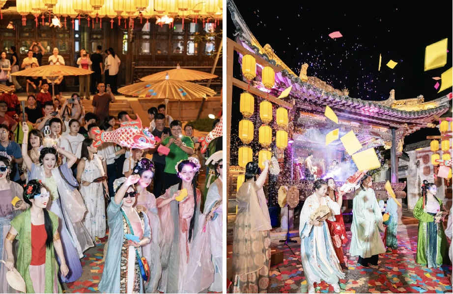 街区精心设置古风露营休憩区、固定时段常态演艺及绝美落日打卡点,让大家在漫步中,全方位感受宋代市井的生机与风雅。