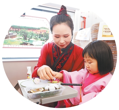 在陕西西安北站开往香港西九龙站的G828次文化主题列车上,汉景帝阳陵博物院工作人员指导小朋友体验文创制作。