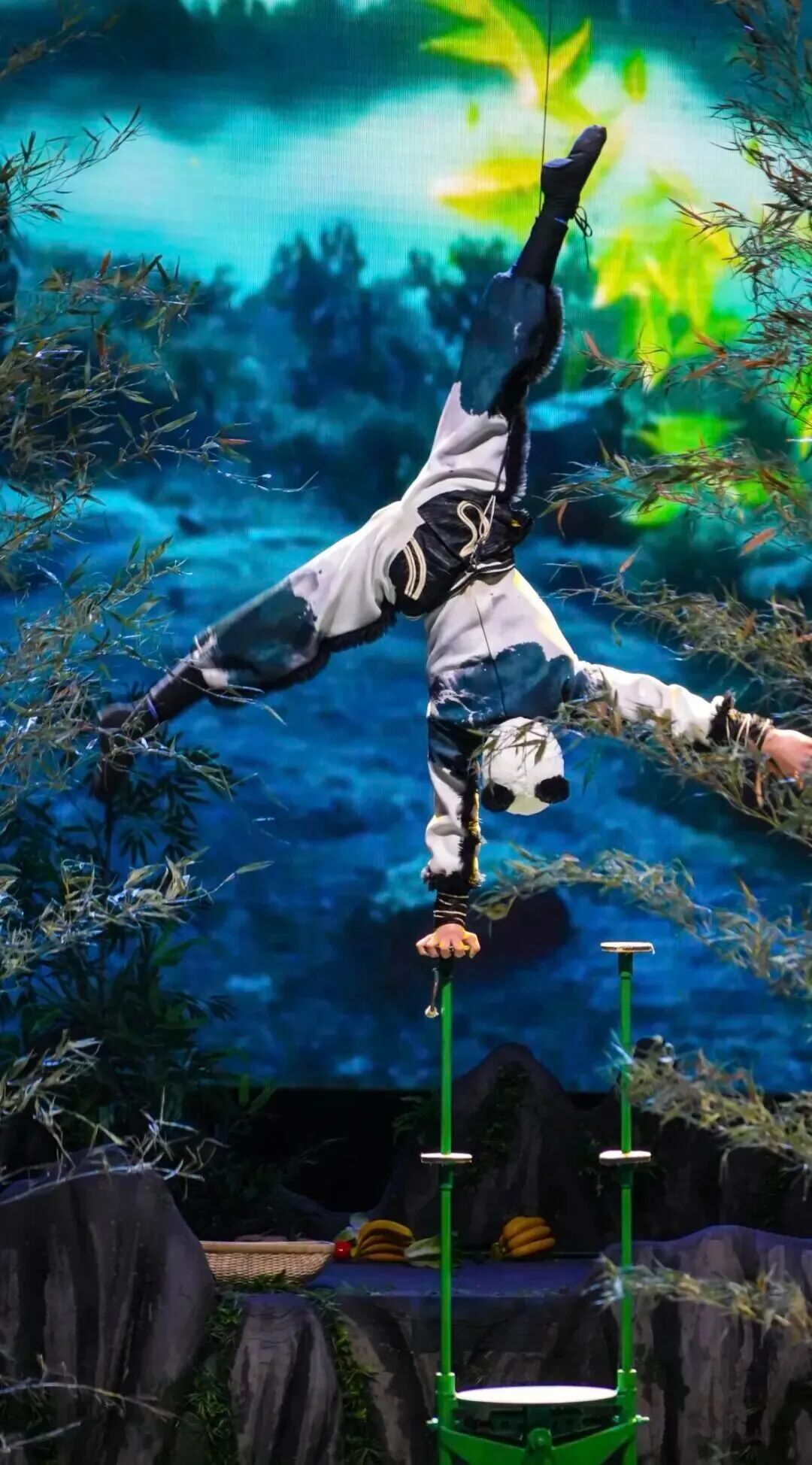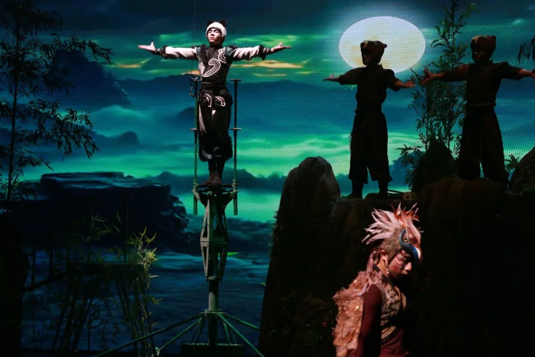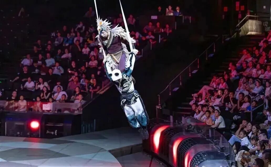 柔术演员更让人惊叹,身体软得像没有骨头,能做出各种超乎想象的动作,不少小朋友看得嘴巴都合不拢;转碟表演超治愈,绿色碟子在演员手里上下翻飞,节奏明快,引得孩子们笑声此起彼伏;绸吊表演直接把人带入梦幻仙境,演员们借着一根绸缎在空中起舞,飘逸又灵动,仿佛熊猫兰溪真的在江湖里飞翔;还有双人吊子表演,两位演员默契配合,空中高难度抛接每一次都紧紧揪住观众的心。