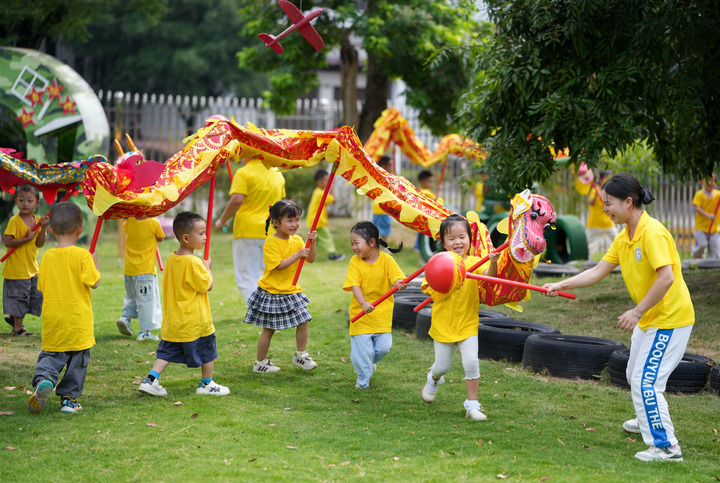 2025年9月5日,四川泸州白酒产业园区天骄托育园的老师带领孩子们舞龙。新华社记者 江宏景 摄