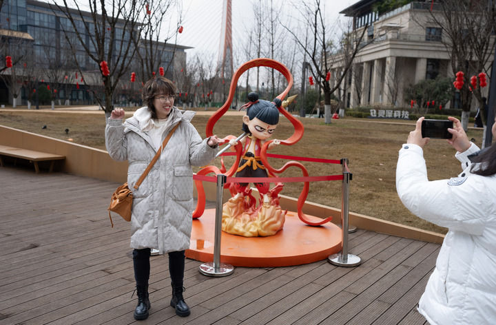 2025年2月8日,影迷在成都天府长岛数字文创园哪吒形象雕塑前合影。新华社记者 江宏景 摄