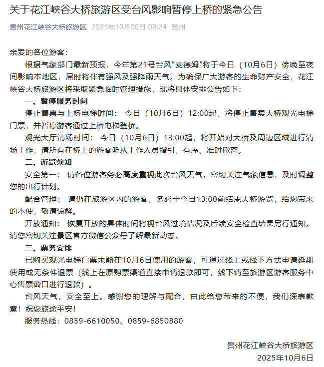 央视网消息:10月6日,贵州花江峡谷大桥旅游区发布《关于花江峡谷大桥旅游区受台风影响暂停上桥的紧急公告》:根据气象部门最新预报,今年第21号台风“麦德姆”将于今日(10月6日)傍晚至夜间影响本地区,届时将伴有强风及强降雨天气。为确保广大游客的生命财产安全,花江峡谷大桥旅游区将采取紧急临时管理措施。
