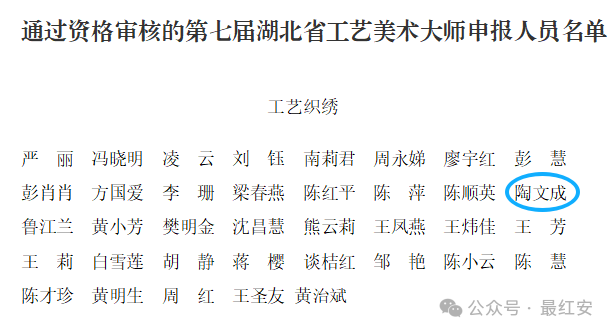 近日,湖北省经济和信息化厅公示了第七届湖北省工艺美术大师通过资格审核申报人员名单,福锦织绣文化传播有限公司总经理陶文成,凭借其精湛的织绣技艺,成功通过“湖北省工艺美术大师”资格审核,这是红安县历史上第1位“湖北省工艺美术大师”。