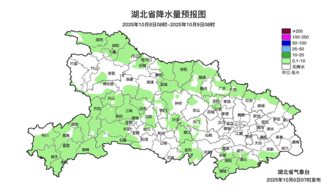 10月8日08时-9日08时,鄂西北、鄂西南阴天到多云有阵雨或雷阵雨;其他地区多云到晴天,局地有阵雨或雷阵雨。最高气温鄂西北26~32℃、其他地区32~36℃,最低气温中西部19~22℃、东部22~26℃,偏东风2到3级。