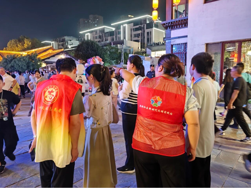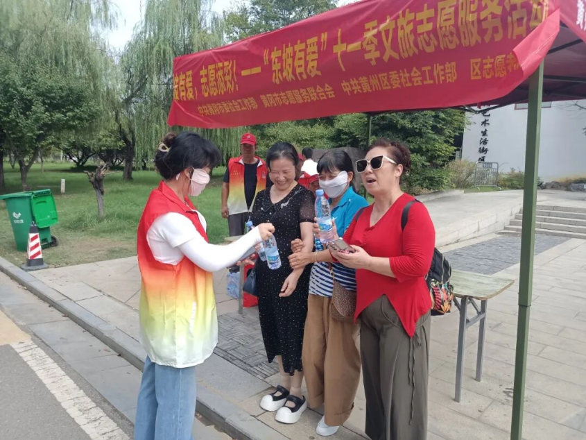 在东坡赤壁、宝塔公园、遗爱湖等景区附近,每天清晨都能看到赤壁街道“东坡有爱”志愿服务队员们忙碌的身影:小小讲解员用清脆童声讲述赤壁历史典故,社区干部化身“安全卫士”疏导人流、提供资讯。志愿者们穿梭在人群中,递地图、送热水、帮扶特殊游客。