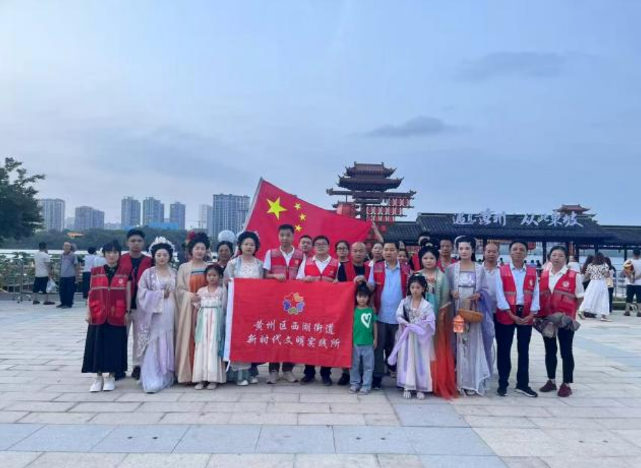 遗爱湖东坡码头的夜色中,西湖街道几位梳着古典发髻、身着飘逸宋制汉服的志愿者,正笑意盈盈地为驻足游客解答疑问。她们时而配合摆出雅致的古典造型,与大家定格温馨合影,举手投足间尽显古典雅致,让游客在享受服务的同时,沉浸式感受东坡文化的独特魅力,成为遗爱湖夜游最亮眼的文化风景线。
