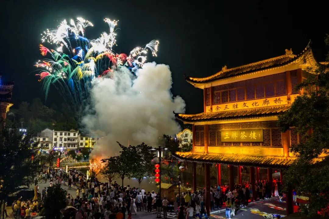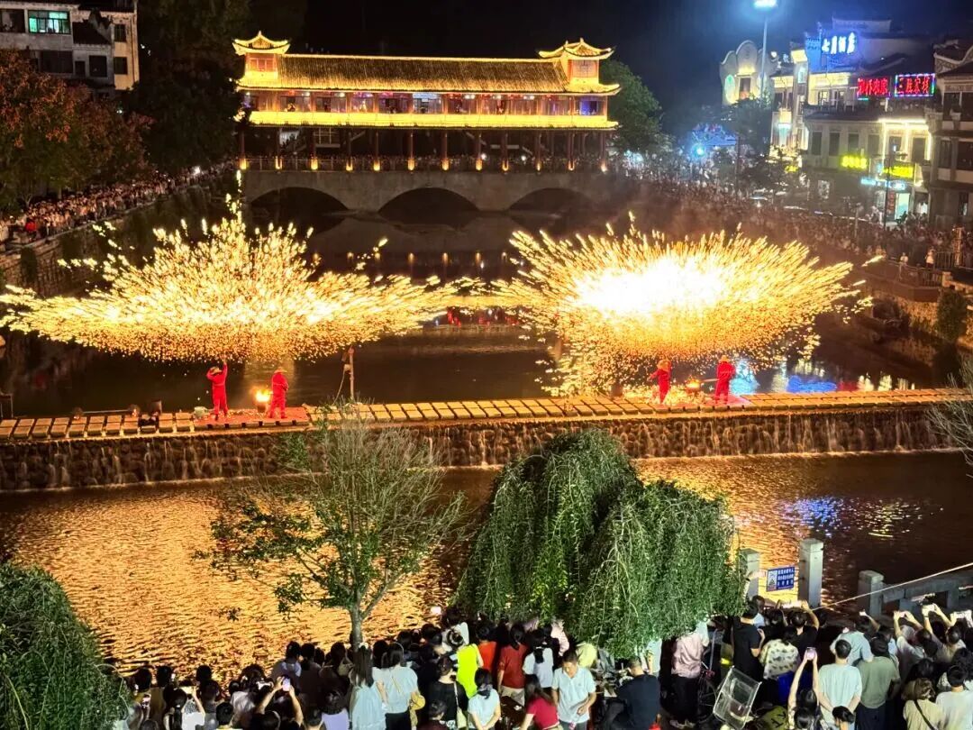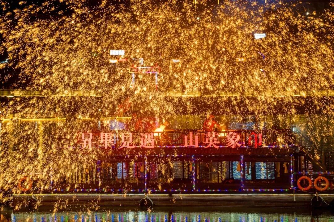 鸠兹古邑的非遗绝技“打铁花”绝对让游客惊艳,匠人们将千度高温的铁水奋力泼洒,瞬间化作满天繁星,如流星雨般倾泻而下,引得观众阵阵惊呼。紧接着,绚丽的烟花秀点亮古镇夜空,古典建筑与璀璨烟花交相辉映,仿佛一场穿越时空的庆典。