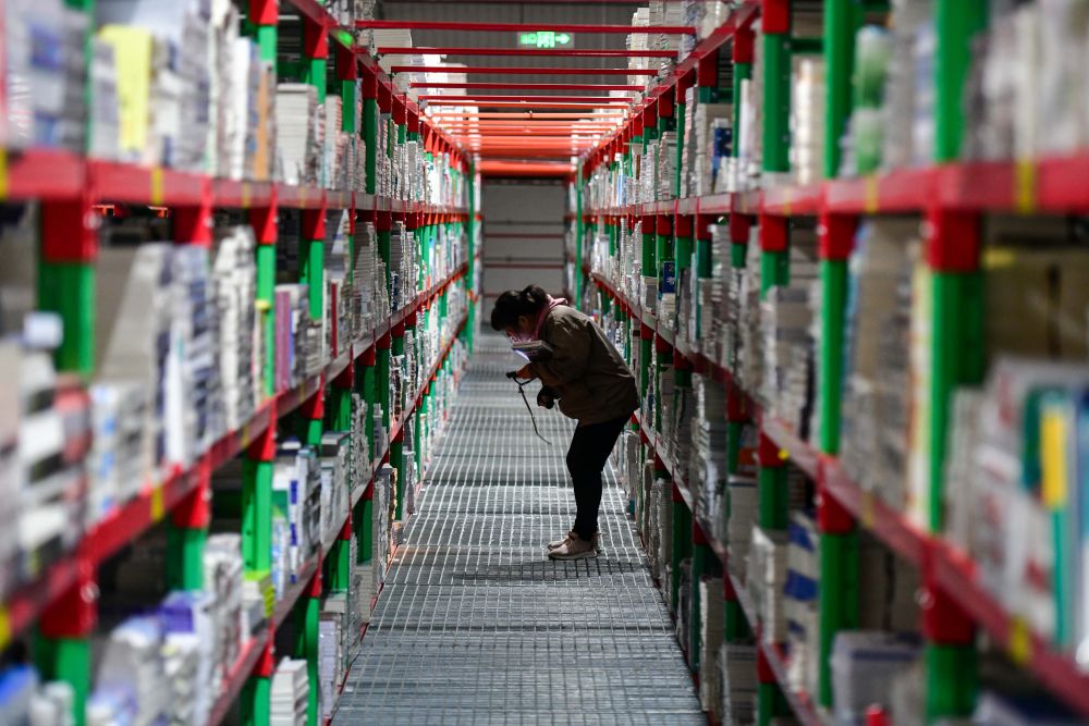 2025年2月19日,工作人员在泰安新闻出版小镇图书仓库内整理书籍。近年来,山东省泰安市立足出版印刷产业优势,打造泰山新闻出版小镇,通过拉长壮大产业链,推动产业集聚发展,构建龙头引领、链条延伸、集群共进的出版印刷产业“雁阵”。目前,小镇已吸引60余家企业入驻,涵盖编辑出版、印刷发行、仓储物流、版权交易、研学旅游等产业链各环节。