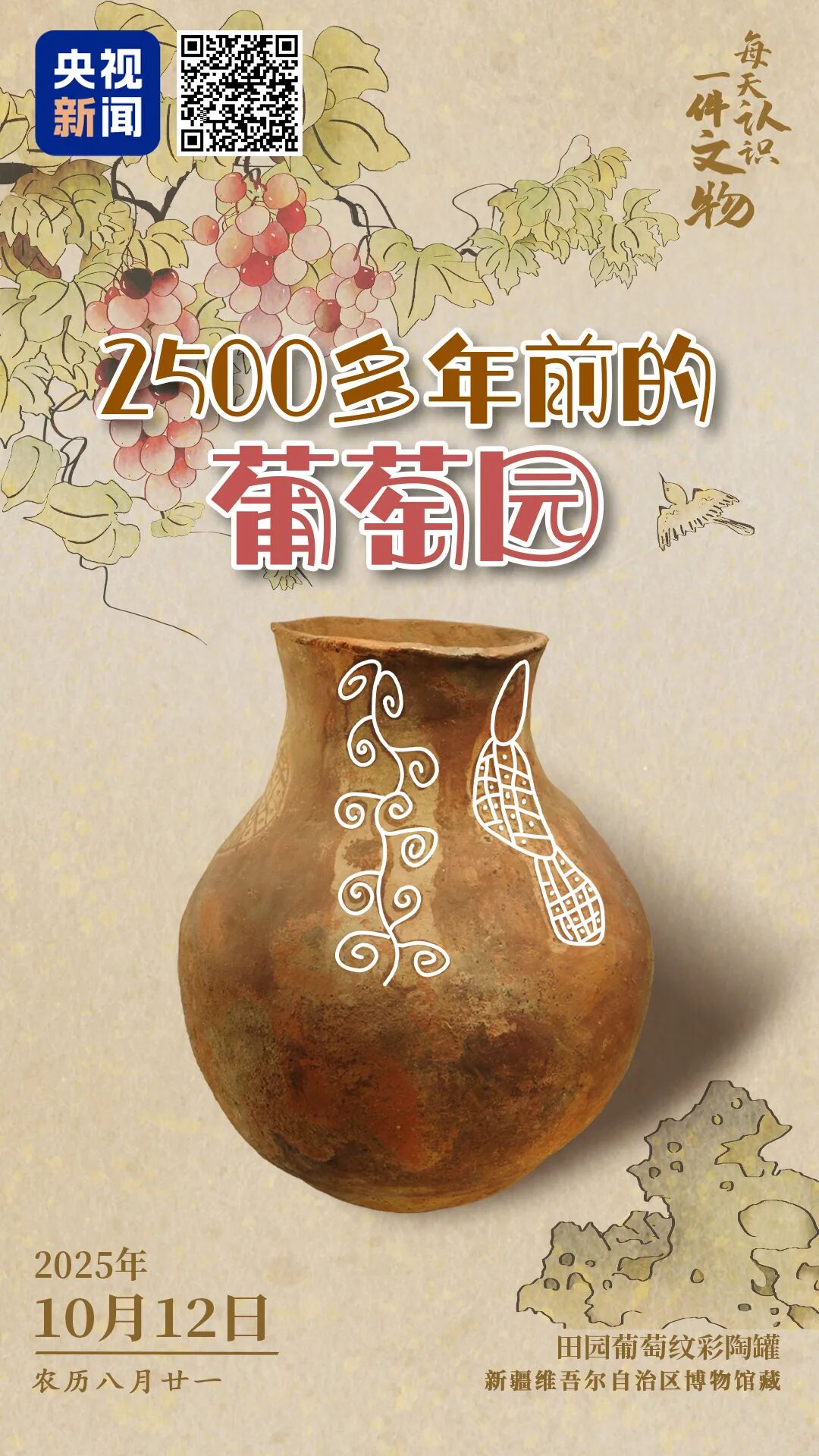 田园葡萄纹彩陶罐,是目前国内出土文物中仅有的一件绘有田地与葡萄纹饰的彩陶罐。古人在陶罐上描绘了2500年前田园的样子,通体红色罐身上绘有蔓藤葡萄纹等四组图案,这些纹饰不仅是装饰,更是先民生活与信仰的真实写照。
