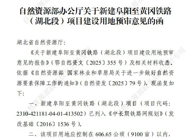 自然资源部办公厅近日印发《关于新建阜阳至黄冈铁路(湖北段)项目建设用地预审意见的函》(自然资办函〔2025〕2263号),标志着该高铁项目建设用地预审获自然资源部批复,为项目全面开工建设奠定了基础。