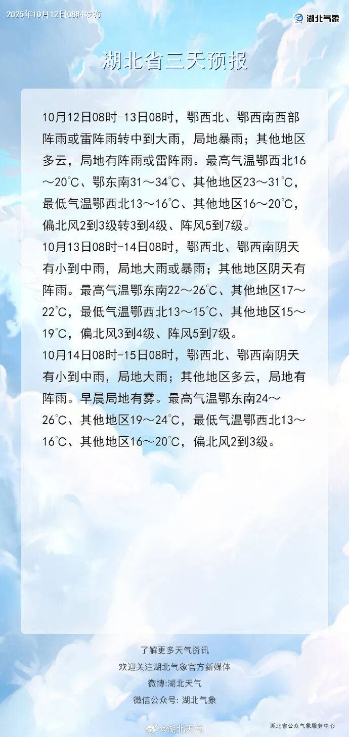 今明两天(10月12日、10月13日)全省风力较大,阵风5到7级,需注意防范大风天气可能带来的不利影响。此外,近期鄂西地区雨水频繁,局部雨量大,需警惕强降雨可能引发的次生灾害。