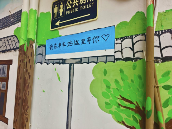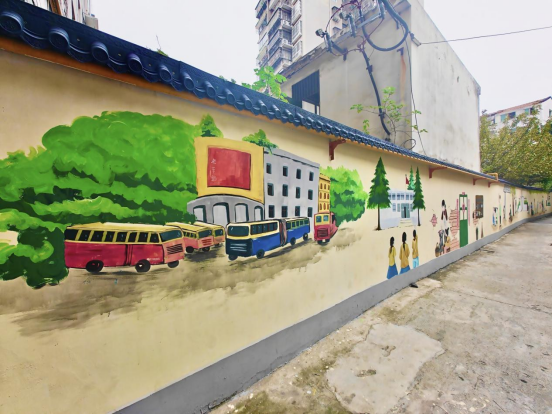 6月,改造工程正式动工。施工团队先对墙体进行基础修复,填补裂缝、平整墙面,再由专业画师现场创作。历经近4个月打磨,到10月初,整面墙体已完成更新。色彩明快的画面中,既有邻里互帮互助的“和谐邻里”场景——老人坐在院坝里教孩子写毛笔字,志愿者帮独居老人拎菜篮;也有充满年代感的“时光画布”——灰砖黛瓦的老车站、摆着糖果和文具的旧杂货铺、挂着“好好学习”标语的老教室,每一处细节都勾起居民的旧时回忆。
