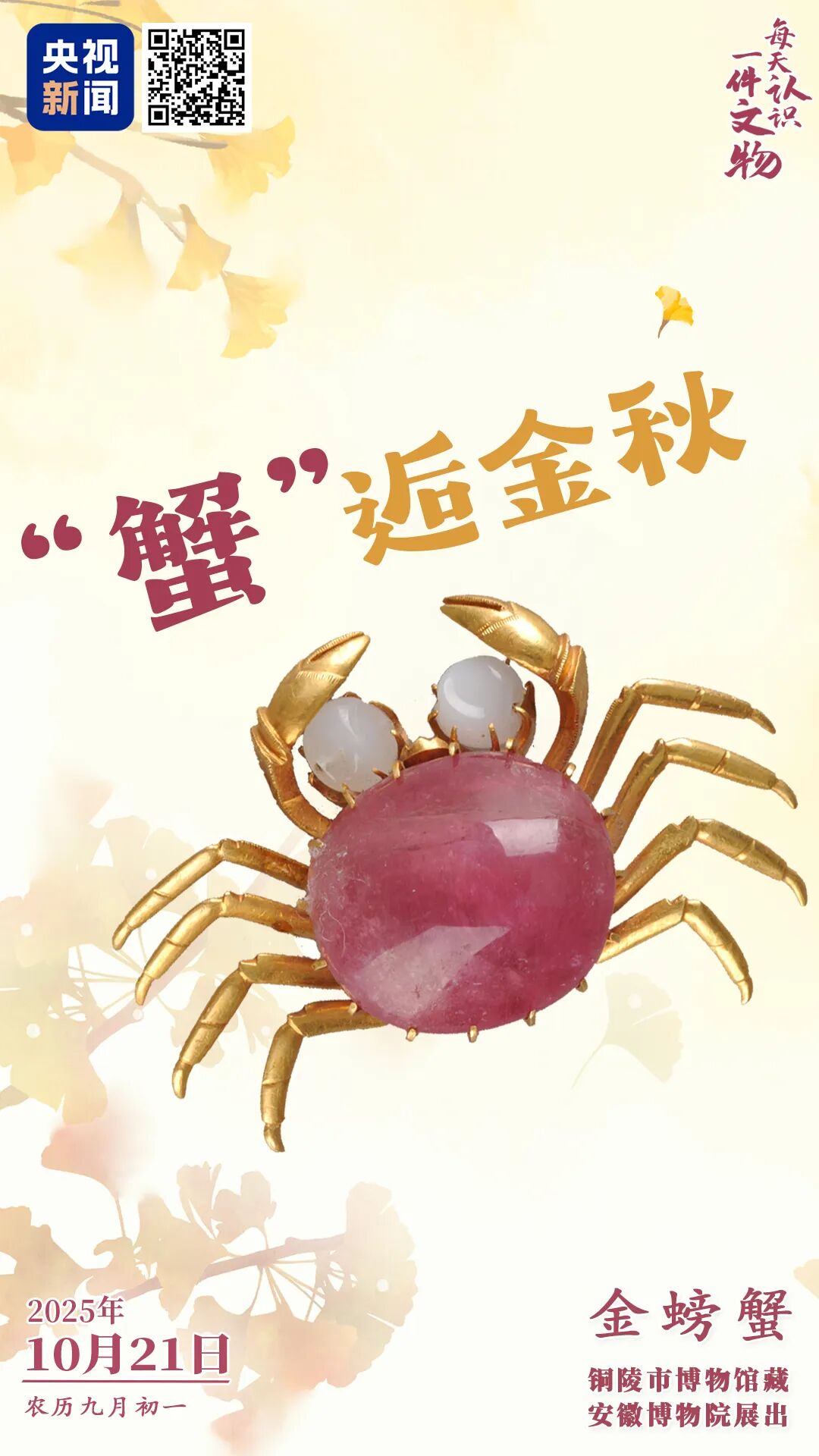 安徽铜陵市博物馆藏的“金螃蟹”,蟹爪和蟹螯为黄金质地,双眼用白玉琢成,蟹身则镶嵌了整块粉碧玺,蟹爪上的关节纹理清晰,蟹螯上还用点状纹饰刻画出了绒毛。这只“秀色可餐”的小螃蟹不光配色高级,各部位也是细节满满!