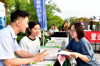 在山东省滨州市惠民县孙武广场,人社局的工作人员向市民介绍社保证明查询相关服务(2025年8月25日摄)。新华社记者 郭绪雷 摄