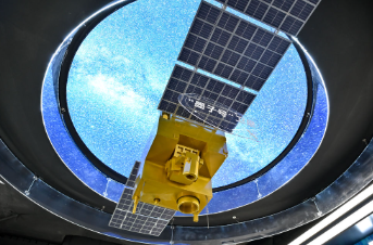 在位于安徽省合肥市的中电信量子信息科技集团有限公司科技体验馆内拍摄的“墨子号”量子卫星模型(2025年7月1日摄)。新华社记者 张铖 摄