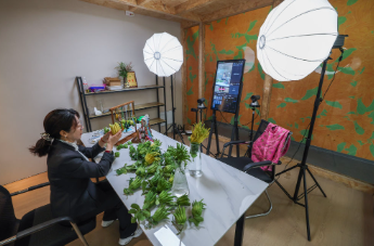 在浙江金华市金东区赤松镇北山口村的金华佛手农林服务中心内的直播间,工作人员进行佛手鲜果及衍生产品的直播销售(2025年10月22日摄)。新华社记者 徐昱 摄