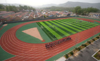 在位于山东潍坊市临朐县石家河村的临朐县弥水教育集团石家河校区,学生在操场塑胶跑道上进行体育锻炼(2025年4月17日摄)。新华社记者 徐速绘 摄