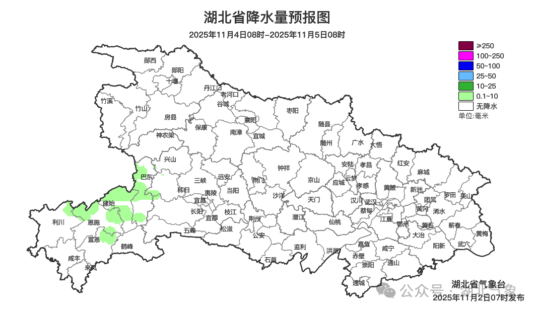 11月4日08时-5日08时,鄂西南零星小雨转多云;其他地区多云。最高气温19~23℃,最低气温7~11℃,偏东风2到3级。