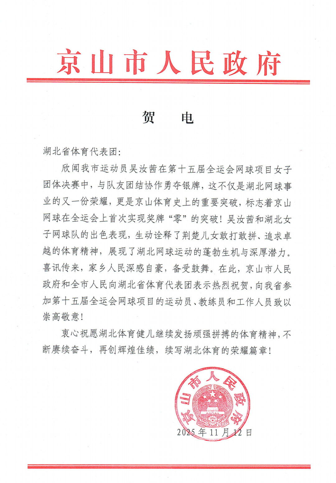 中共京山市委、京山市人民政府在贺电中表示,吴汝茜和湖北女子网球队的出色表现,“标志着京山网球在全运会上首次实现奖牌‘零’的突破”,并寄语她继续发扬拼搏精神,续写湖北网球的荣耀篇章。