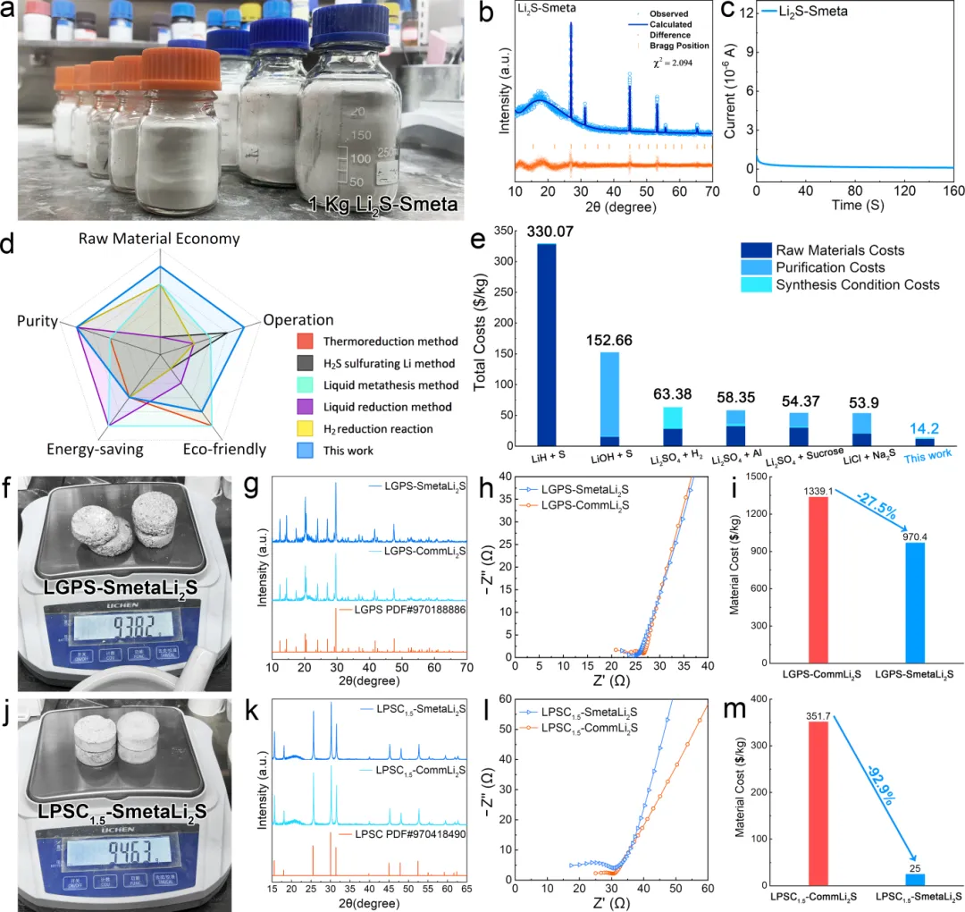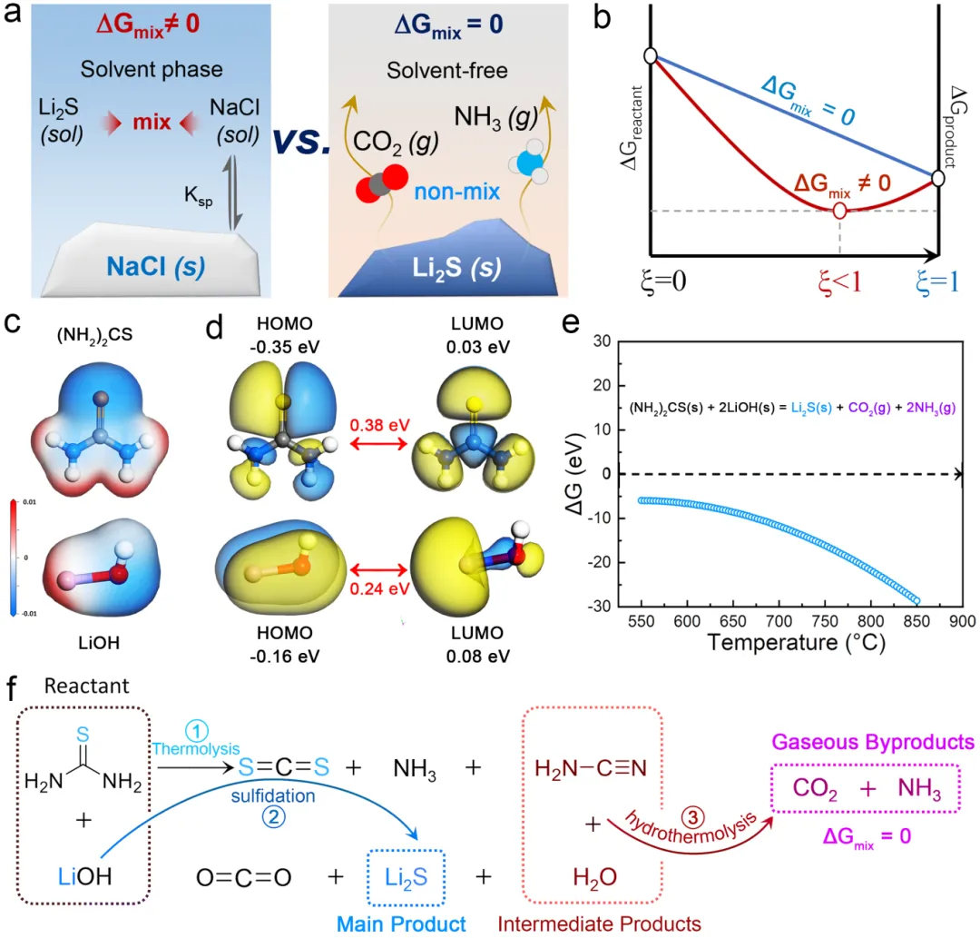 该研究成果提出了一种无溶剂复分解反应(metathesis)法,利用廉价、安全的硫脲(thiourea)作为S2⁻供体与LiOH反应,在无溶剂体系下直接生成高纯Li2S,并伴随CO2与NH3气体自发逸出,从而避免了传统液相法中ΔGmix引起的平衡限制,实现反应完全转化与高纯产物获得。该成果首次实现了以固体硫脲为硫源的无溶剂绿色合成路线,突破了传统液相体系中产物转化不完全与纯化成本高的问题,为高纯Li2S的大规模、低成本生产提供了切实可行的新思路。该策略不仅有望显著降低硫化物固态电解质产业化门槛,也为绿色电池材料化学的发展提供了范式,推动固态电池商业化进程。