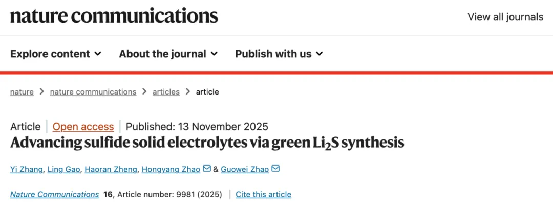 11月13日,黄冈师范学院化学化工学院赵国伟研究团队在全固态电池固体电解质关键材料领域取得重要研究进展,相关研究论文《Advancing sulfide solid electrolytes via green Li2S synthesis》在Nature子刊《自然·通讯》(Nature Communications)上发表。