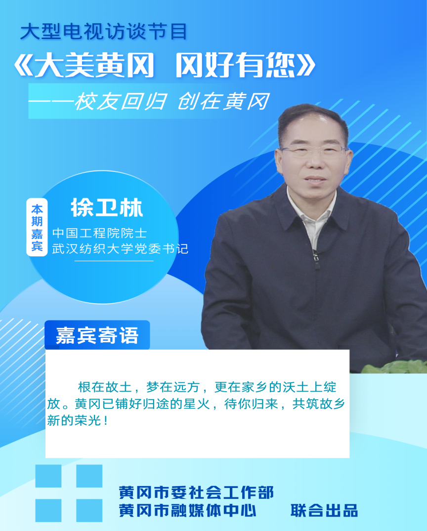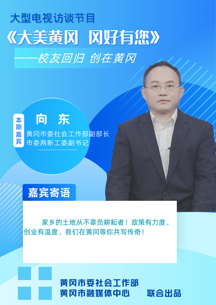 11月18号,由中共黄冈市委社会工作部与黄冈市融媒体中心联合主办的《大美黄冈 冈好有您》节目,将在黄冈电视台综合频道播出。本期节目以“校友回归 创在黄冈”为主题,聚焦黄冈市助力校友回归、支持高校师生创新创业,特别邀请校友回归典型代表、相关职能部门负责人及行业专家担任嘉宾,通过详实数据呈现成效、鲜活案例解析实践、全面展示良好环境,生动阐释黄冈市在推动校友回归和高校师生创新创业进程中的具体举措与实践成果,为有志归乡创业的校友及高校师生提供清晰指引。