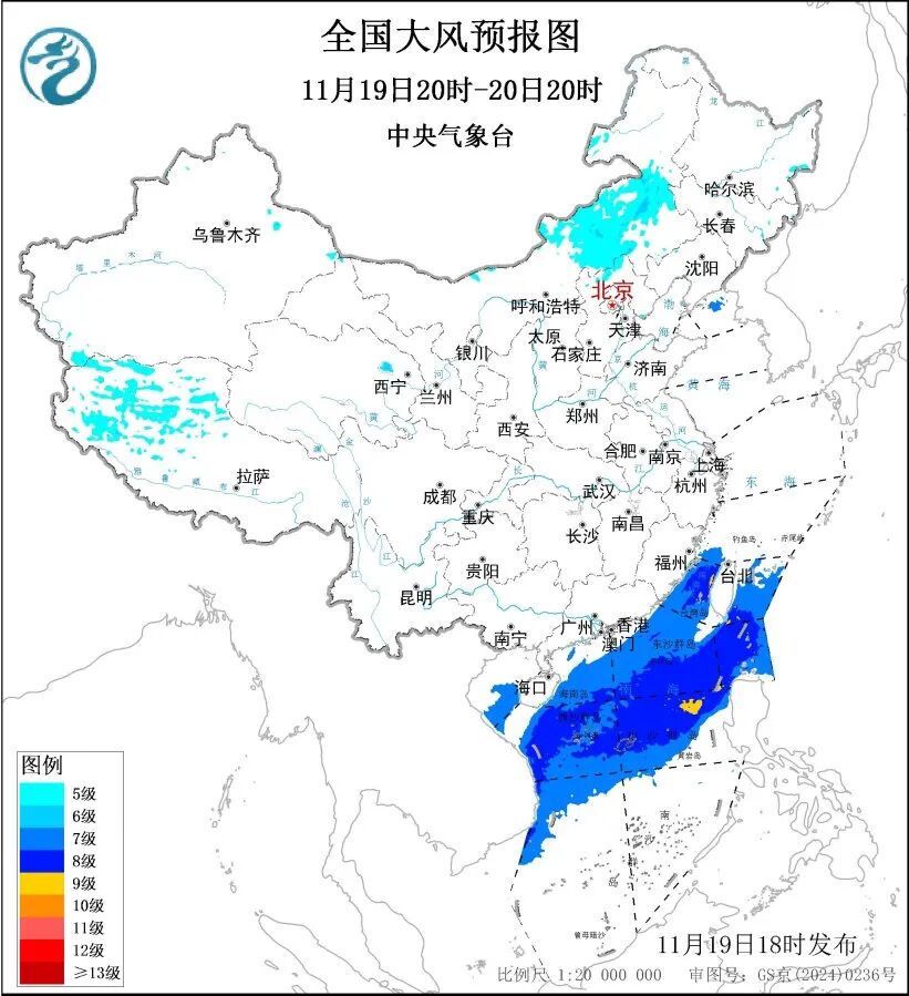 中央气象台19日18时继续发布大风蓝色预警,预计19日20时至20日20时,内蒙古中东部、西藏西部等地部分地区将有5~6级风,阵风7~8级;台湾海峡、台湾以东洋面、巴士海峡、南海北部和中部海域、南海西南部偏北海域、北部湾偏南海域将有7~8级、阵风9~10级的大风。