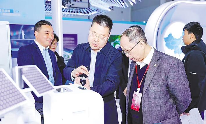 武汉新烽光电股份有限公司董事长武治国(左)在展会上介绍产品。(受访者供图)