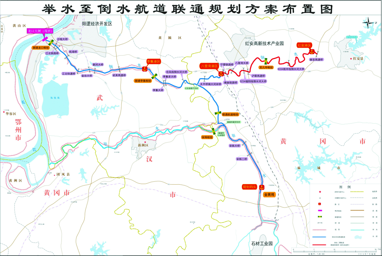 建设红安至龙口82.5km航道及其配套措施,50.4km为Ⅲ级货运航道,32.1km为Ⅵ级旅游航道,布局3个港区,建设4处锚地,投资约48.7亿元。联通红安楼子凹村至麻城小洲塆村11.5km航道,建设太平桥枢纽,投资约22.7亿元。治理河长56.537km,岸坡治理54.371km,拆建机耕桥等,完善水雨情监测系统,投资3亿元。建设城区第二污水处理厂及管网22.5km,投资1.06亿元。整治城南污水管网28.5km,投资1.12亿元。开展流域综合治理,投资15亿元。航道建设及联通项目优化区域航运网络,降低货运成本,带动物流与旅游业发展;流域治理及污水处理工程改善水质与生态环境,保障生态安全,提升区域环境质量,利于吸引投资,推动经济社会协调可持续发展。