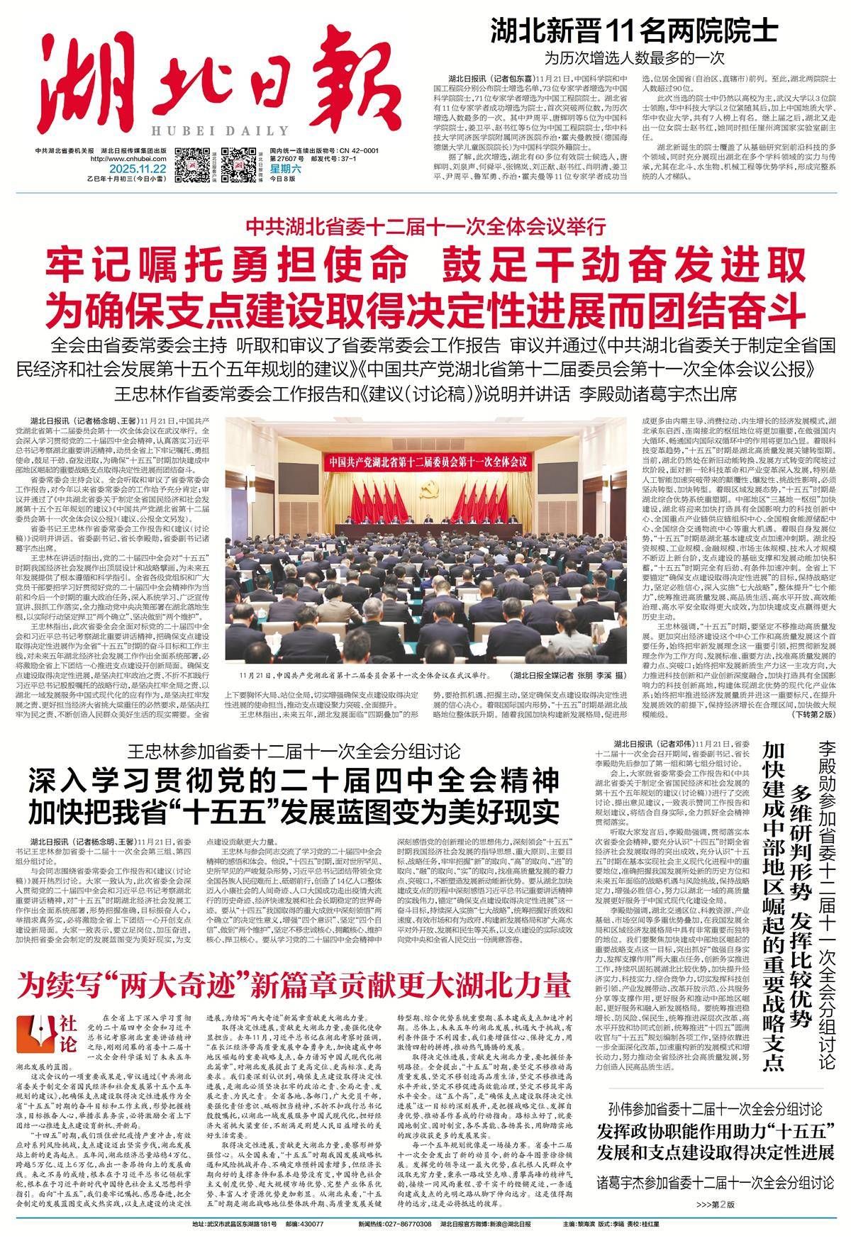 今年是“两个一百年”奋斗目标的历史交汇点、两个“五年规划”的发展交汇点,湖北将牢记嘱托,深入学习贯彻党的二十届四中全会精神,谋深做实即将出炉的“十五五”规划,把全部工作向“支点建设”聚焦聚力,将“支点建设”的旗帜举得更高更稳,努力把总书记为湖北擘画的宏伟蓝图变成美好现实!