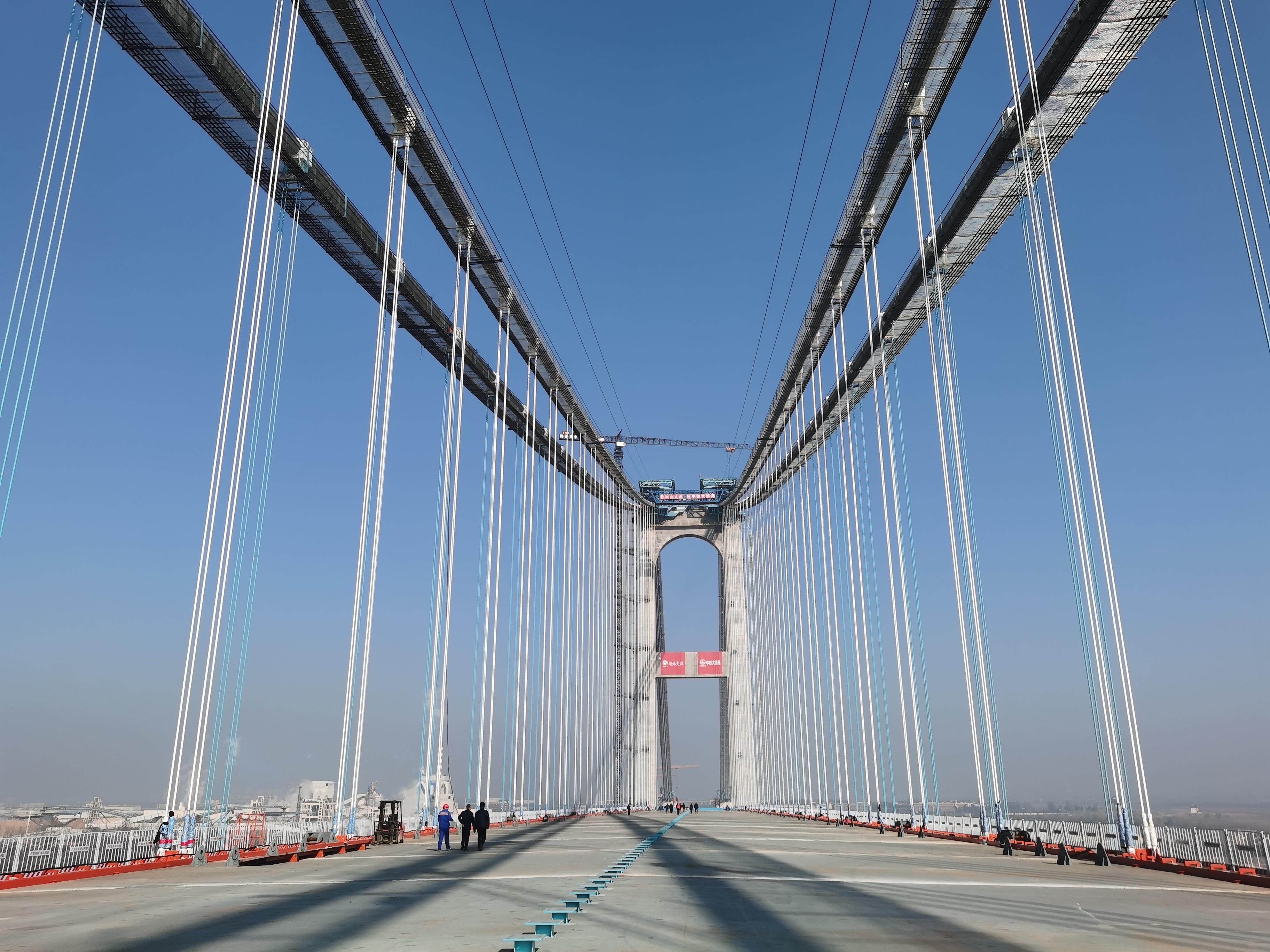 大桥全桥钢梁共计69节段,标准梁段长27米、宽41米、桁高9.5米,单片最大重量约830吨,全桥钢梁总重约5.6万吨。为将如此庞大的钢桁梁吊起来,全桥通过两台缆载吊机,从跨中向两岸同步对称吊装,并在国内外桥梁建设中首次大规模采用全焊式索夹,实现索夹的轻型化、标准化制造。
