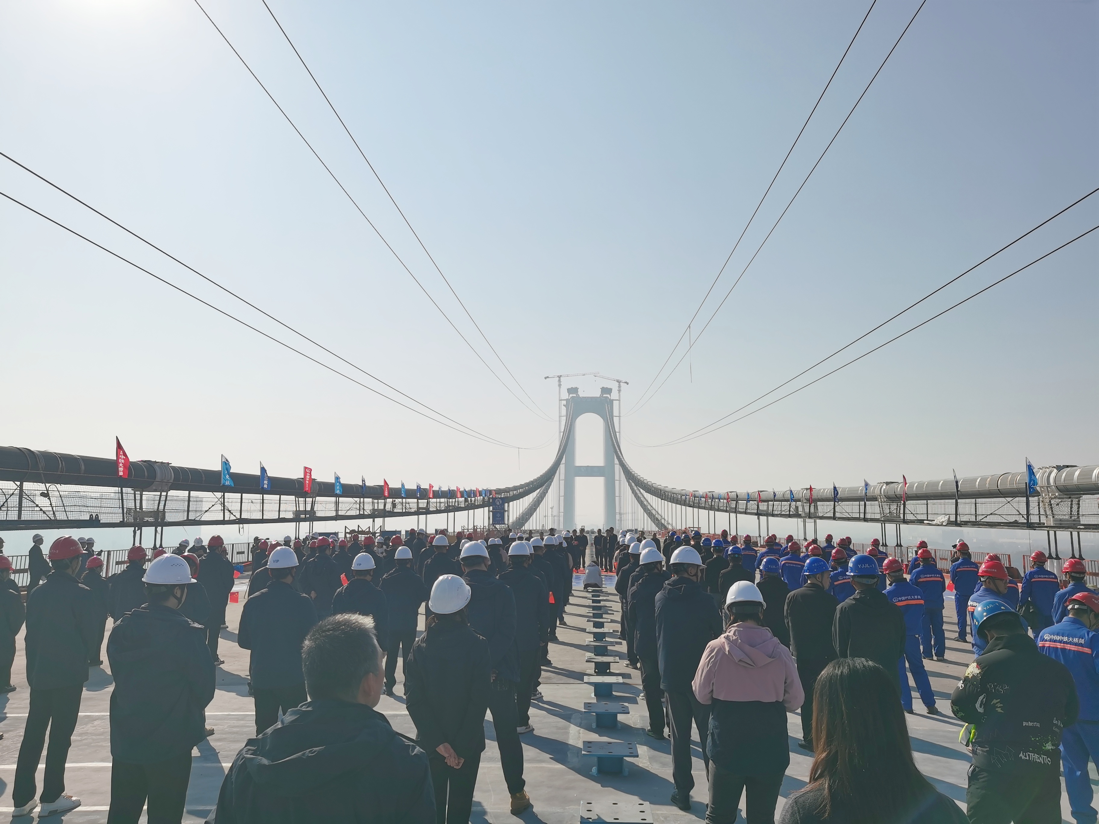 为解决不同垂直四主缆钢梁吊装存在的技术难题,在中铁大桥局集团公司领导和专家团队的指导帮助下,项目建设团队前期进行了大量调查研究,以及多方案论证、比选;施工前组织了多轮次的技术安全交底和专题培训;施工中严格落实领导带班制度,项目部、中铁大桥局机施公司齐心协力并严格落实“一吊一检”;建立定期协调机制,邀请海事、航道等单位参与协调会,持续优化施工组织和工序衔接,确保吊装作业无缝衔接、快速推进。