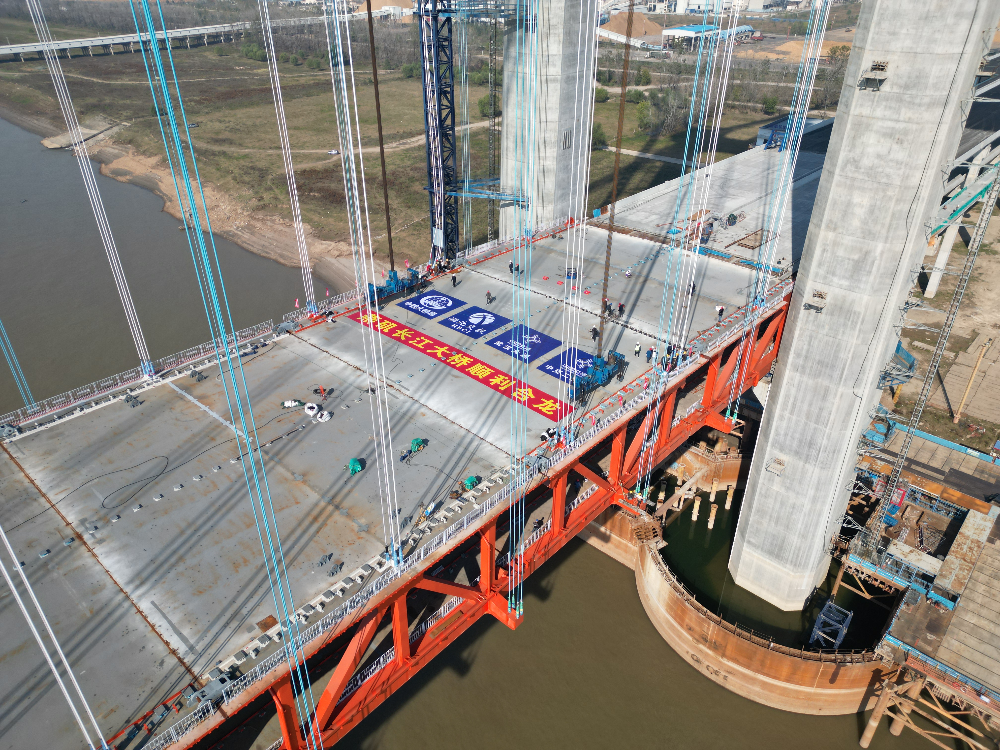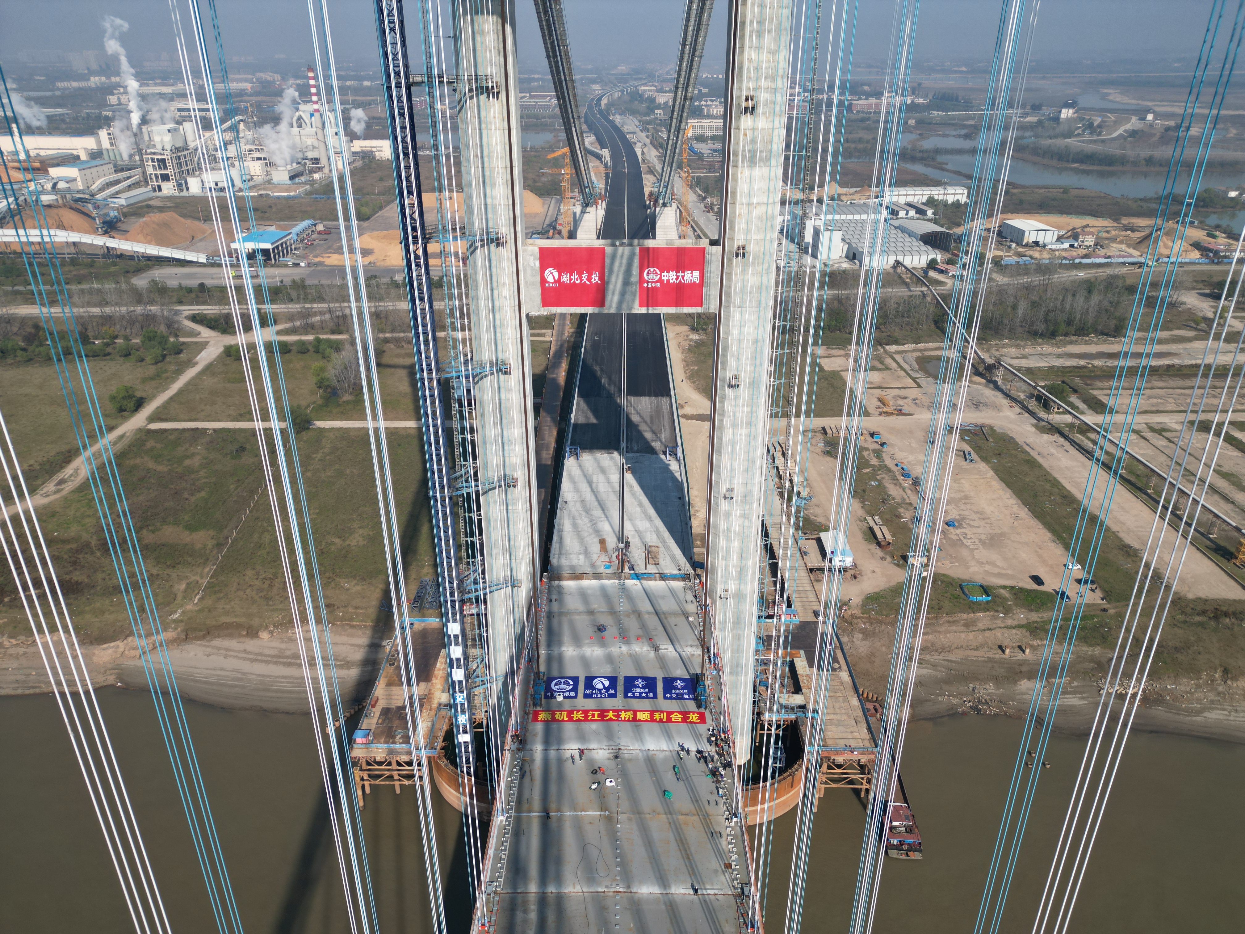 本报讯(记者郭唐珍 通讯员夏彬 王洪松 潘攀)11月22日,随着最后一段钢桁梁精准吊装到位,由湖北交投投资、中铁大桥局承建的世界最大跨径四主缆悬索桥——湖北燕矶长江大桥顺利合龙,标志着大桥主体结构全面完工,正式转入桥面及附属设施施工阶段。