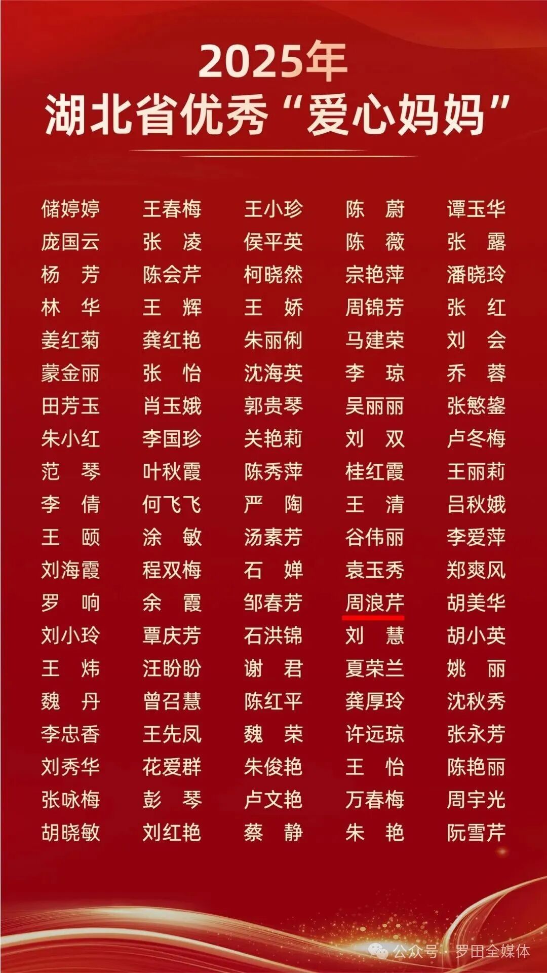 其中,罗田县周浪芹名师工作室爱心妈妈志愿服务队获评湖北省百名优秀“爱心妈妈”称号。