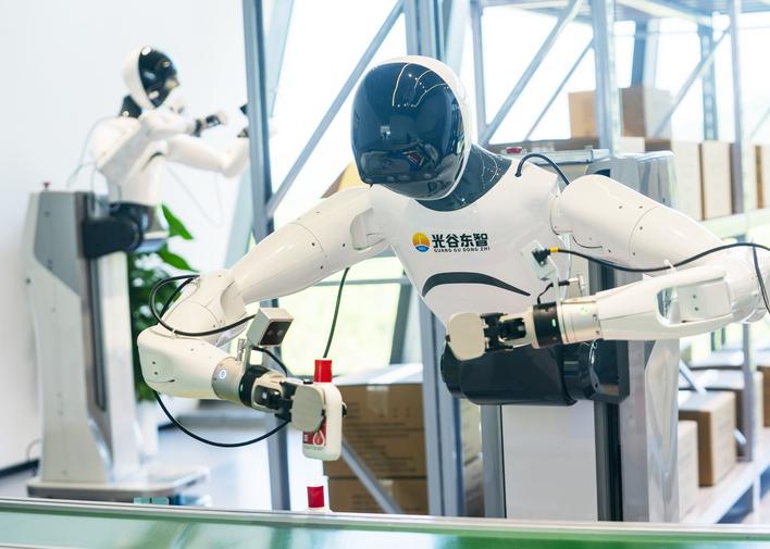 湖北人形机器人创新中心,人形机器人在生活、生产场景中,进行各种动作训练。