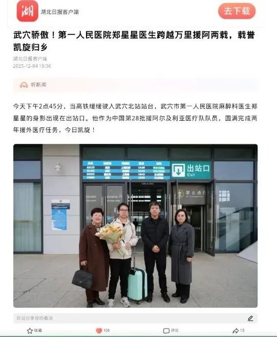 12月4日下午2点45分,当高铁缓缓驶入武穴北站站台,武穴市医共体总医院(市第一人民医院)麻醉科医生郑星星的身影出现在出站口。他作为中国第28批援阿尔及利亚医疗队队员,圆满完成两年援外医疗任务,今日凯旋。