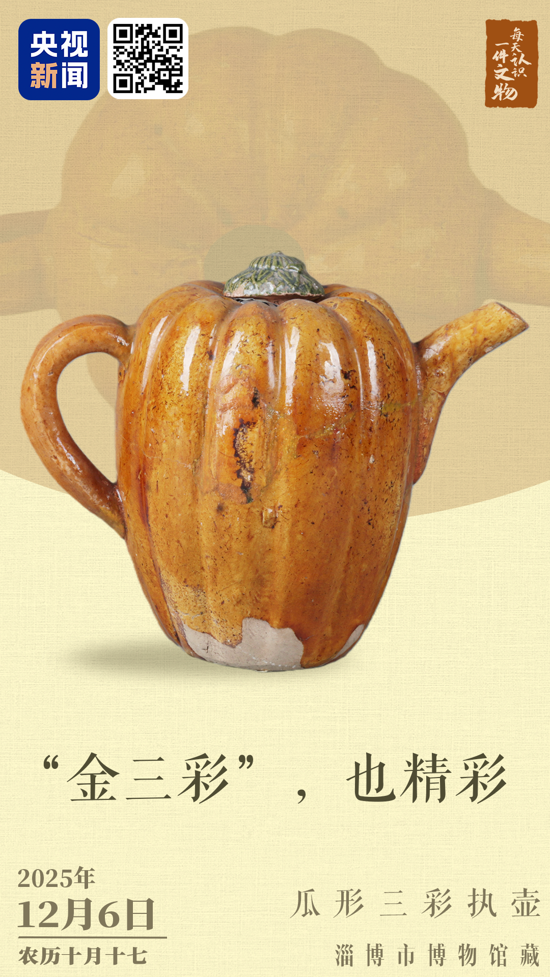 央视新闻联合全国博物馆推出文博科普产品《文博日历》,每天带你认识一件文物。瓜形三彩执壶,小口深腹平底,壶身有瓜棱,一侧伸出弧状短流,一侧有拱形把手,壶盖呈两层瓜蒂形,施绿色釉,惟妙惟肖,仿生逼真。淄博窑“金三彩”,既沿袭“唐三彩”工艺,又有所创新,兼具生活实用与艺术陈设价值。