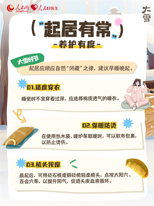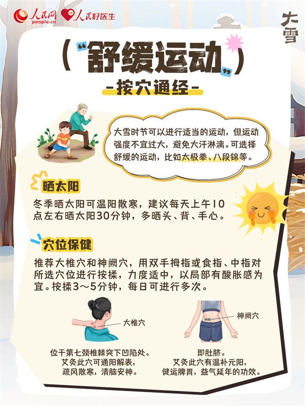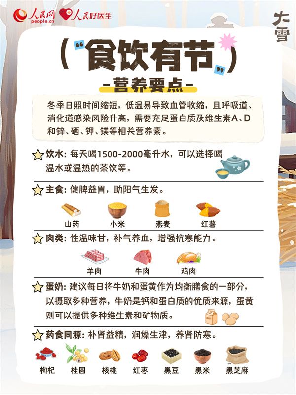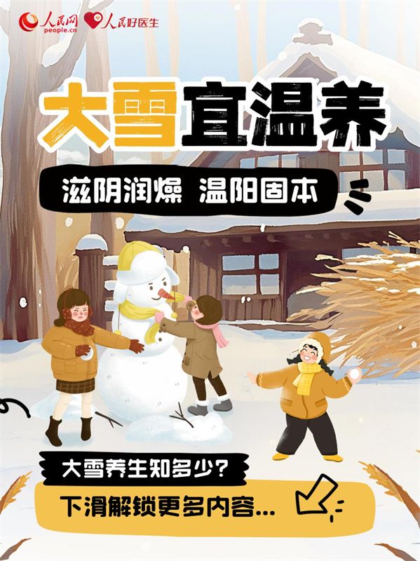 大雪时节,人体阳气内敛,脾胃功能偏弱,养生重在温补肾阳,调理气血,同时兼顾润燥滋阴。“冬天进补,开春打虎”,此时适当进补,起居调养,适当运动,能增强机体免疫力,预防疾病。