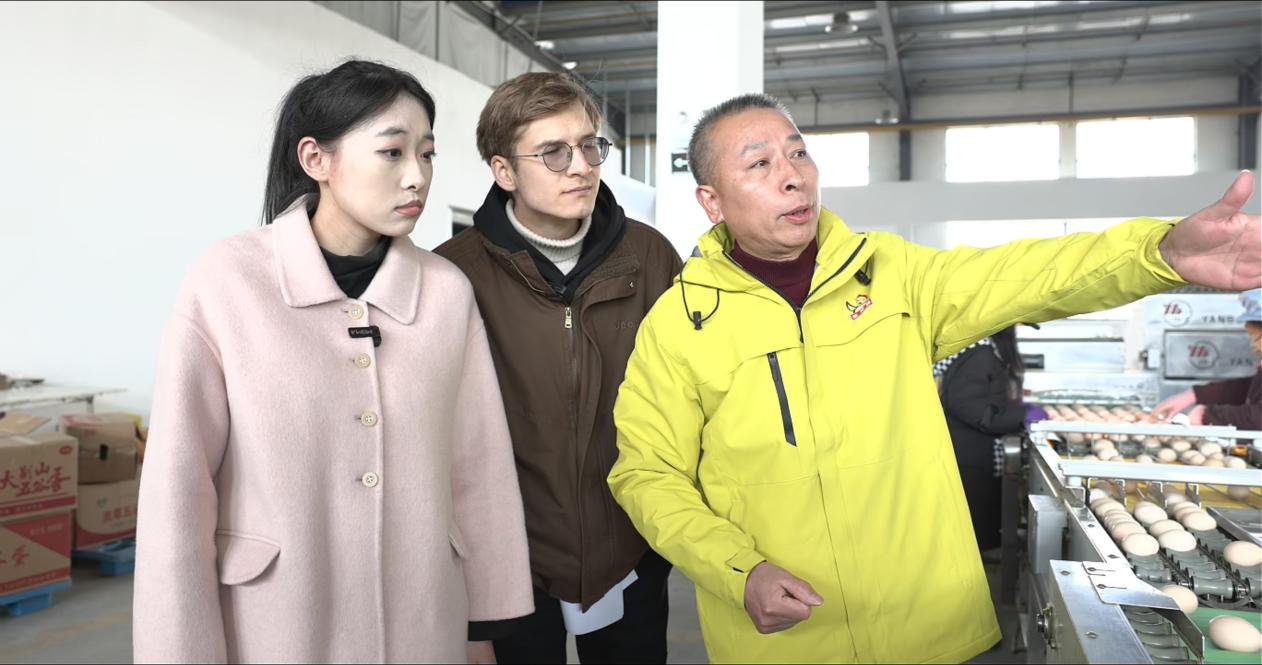 家美鲜蛋业负责人袁绪东带领叶国和主持人雨欣参观鸡蛋分拣车间
