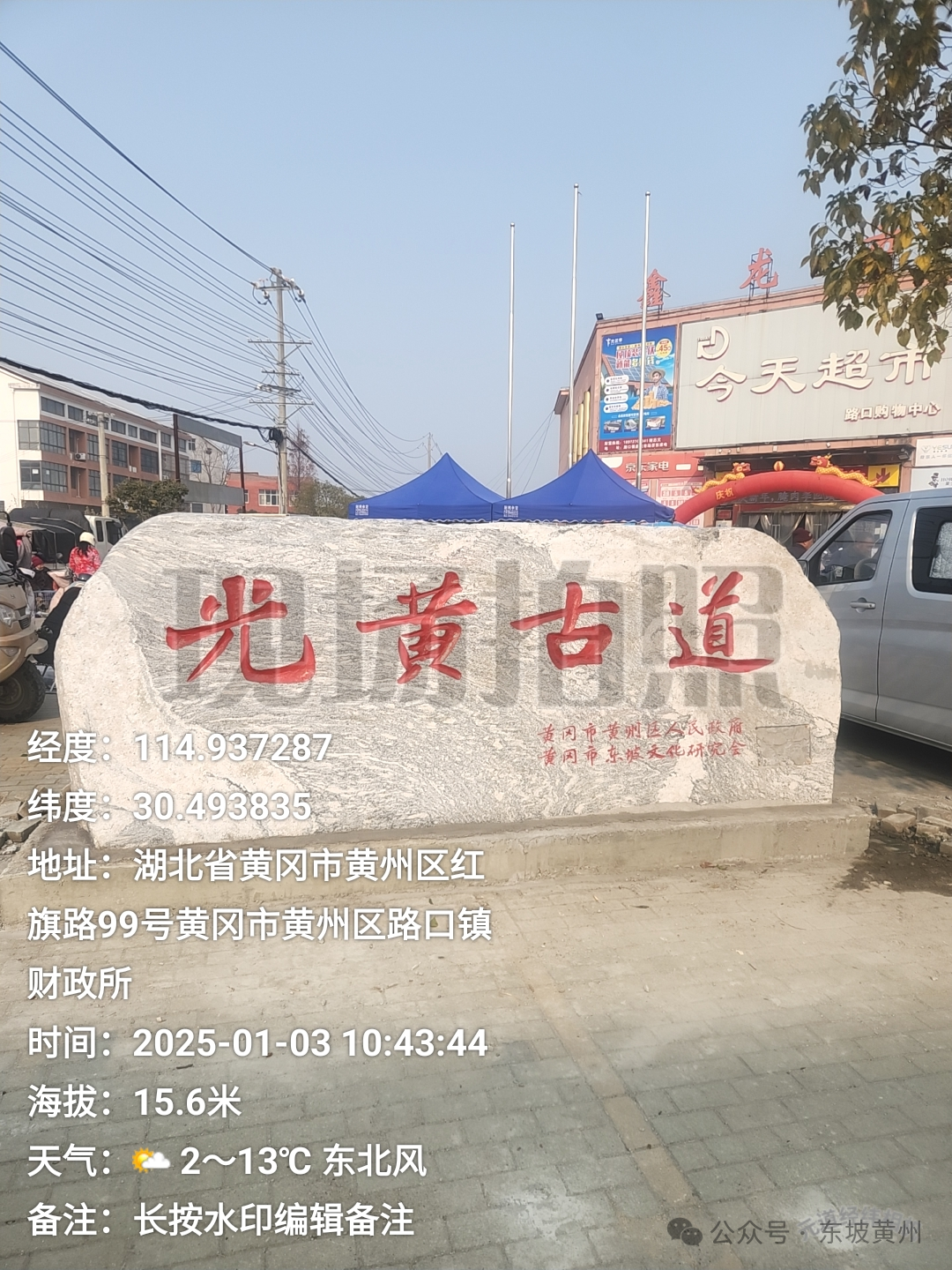 根据以上文章及历史资料记载,考察人员进行现场考证并研讨、分析、认定:光黄古道位于黄州区路口镇路口村(经度:114.951837 纬度:30.510419 海拔:25.6米)原黄州东门路到陶店的老106国道上。