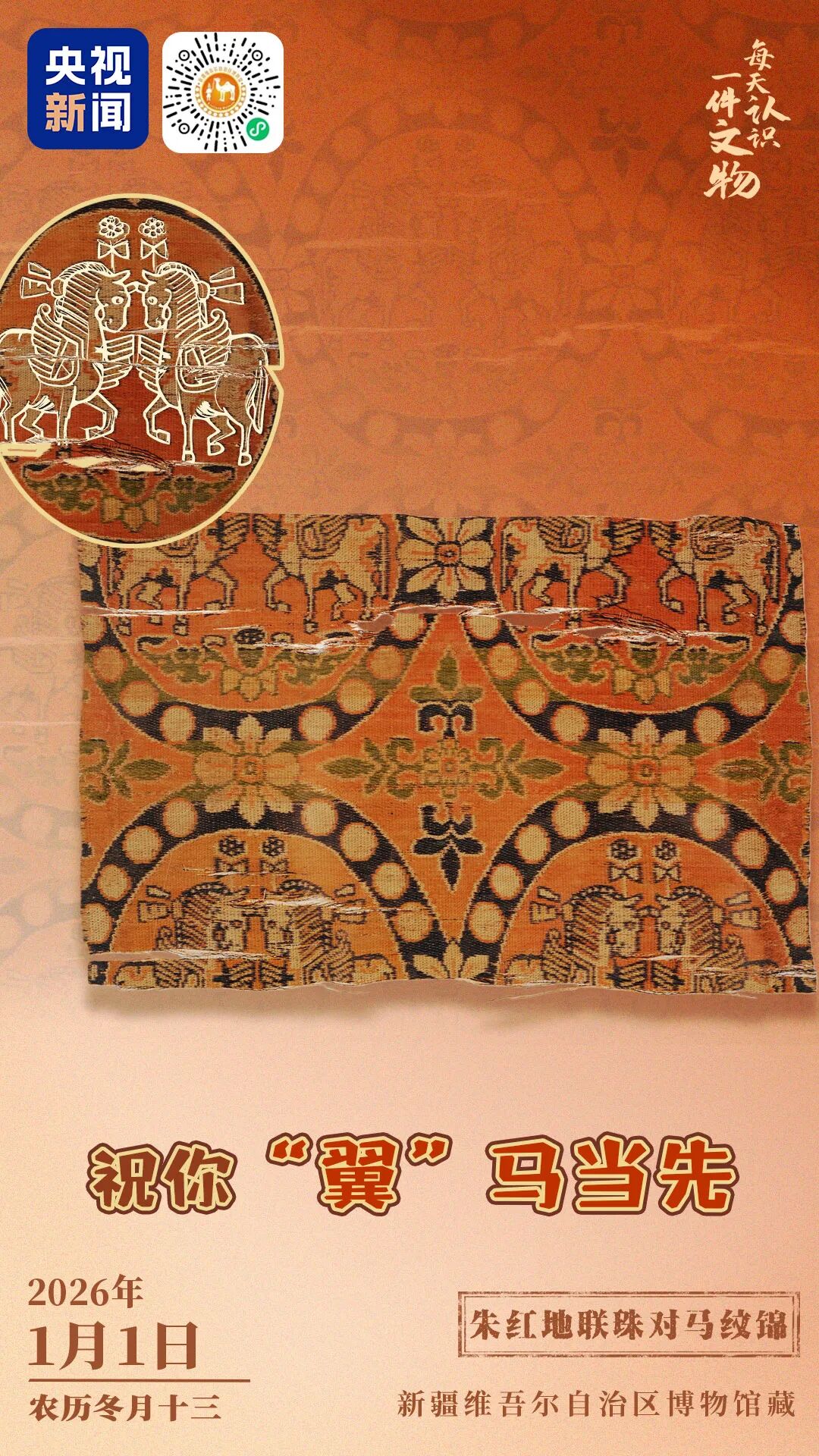 朱红地联珠对马纹锦,收藏于新疆维吾尔自治区博物馆。这一对骏马从头到脚都透着动感和活力,最为抢眼的是一双翅膀,让这对四蹄错落似要驰骋的骏马,好像跑着跑着就可以起飞。织锦工匠以红色丝线做底,用白、黄、绿等颜色凸显花纹,让联珠对马纹和辅助的四叶纹、忍冬纹向四方连续。