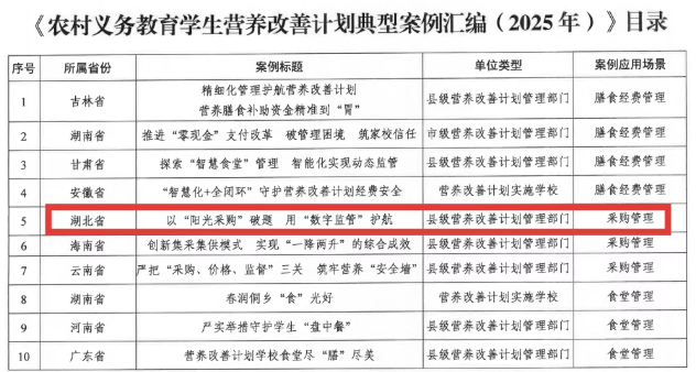 近日,在教育部《关于印发<农村义务教育学生营养改善计划典型案例汇编(2025年)>的通知》中,团风县报送的《以阳光采购破题用数字监管护航》案例成功入选,是全省唯一县域代表。