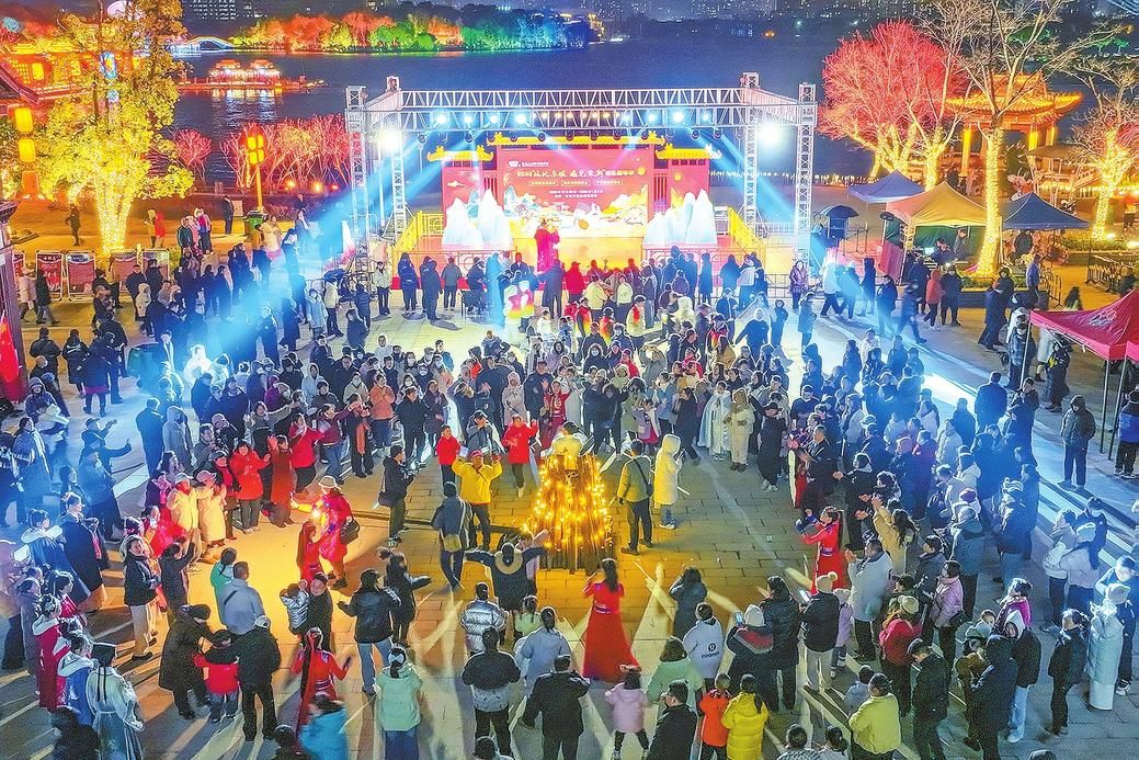 黄梅戏水袖轻扬,荡开千年宋韵云烟;无人机流光闪烁,重绘夜空璀璨画卷;吊锅烟火升腾,暖透冬日寒夜;灯影轻舟摇曳,划破历史时空波澜……