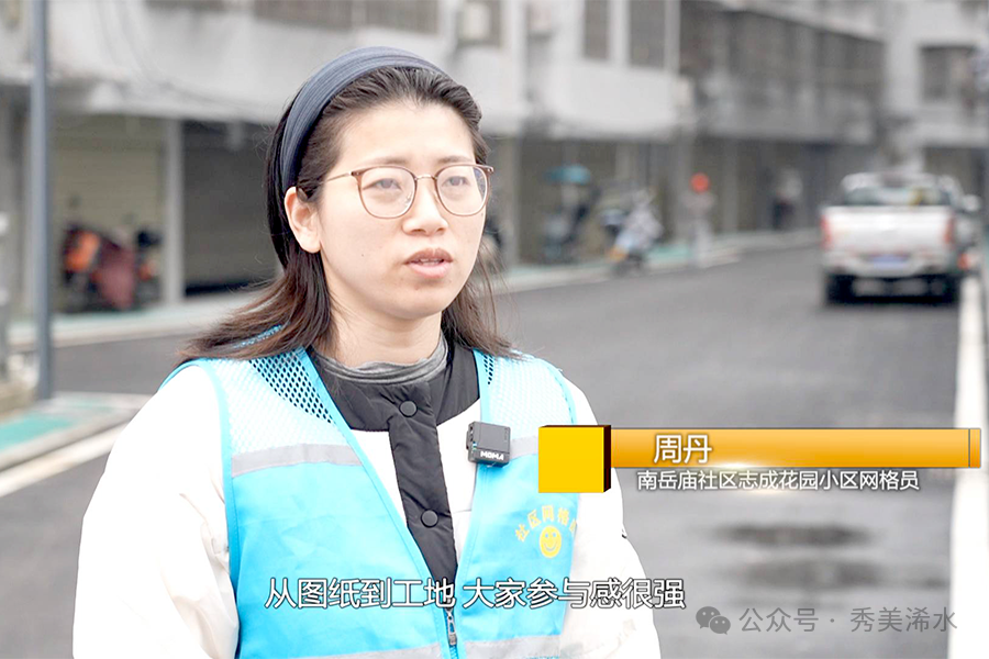 南岳庙社区志成花园小区网格员 周丹:我们邀请热心居民当“质量监督员”。从图纸到工地,大家参与感很强,从“旁观者”变成了“共建者”。比如充电桩的选址,就是大家商量着定的。